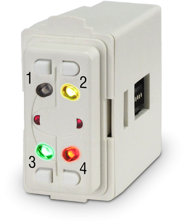 Lettore di prossimità bianco per flange Ticino Magic dotato di 4 LED di sistema e 4 tasti di parzializzazione per connessione su seriale RS-485 compatibile con centrali serie CEM, FLEXENERGY, ETR, ETREX, GENIODOMO e GENIOPLUS.